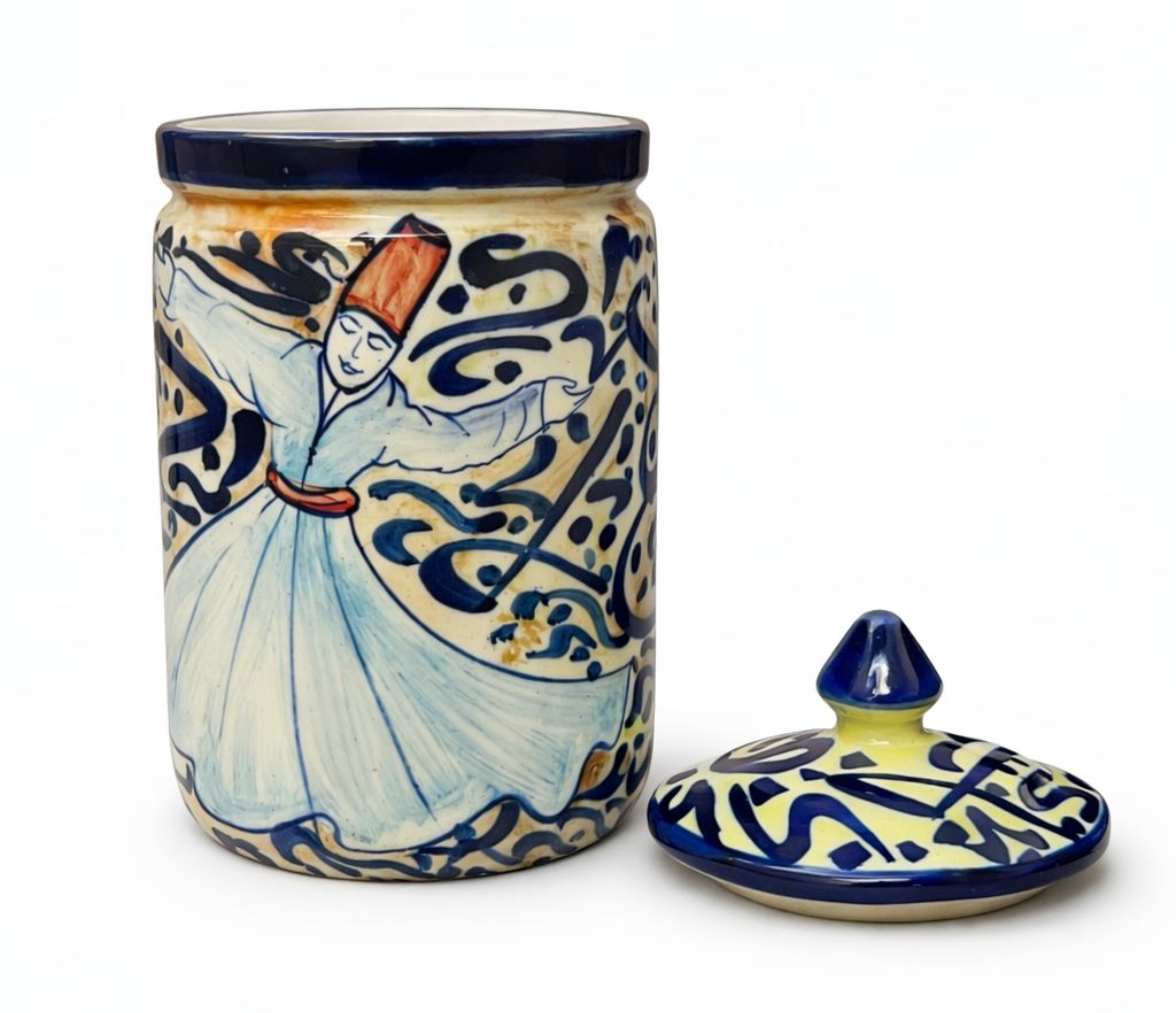 Make a bold statement in your home with this stunning handcrafted pottery jar, featuring striking calligraphy-inspired artwork in deep cobalt tones. Finished with a glossy lid and a beautifully detailed body, this piece blends traditional artistry with a modern, collectible feel.