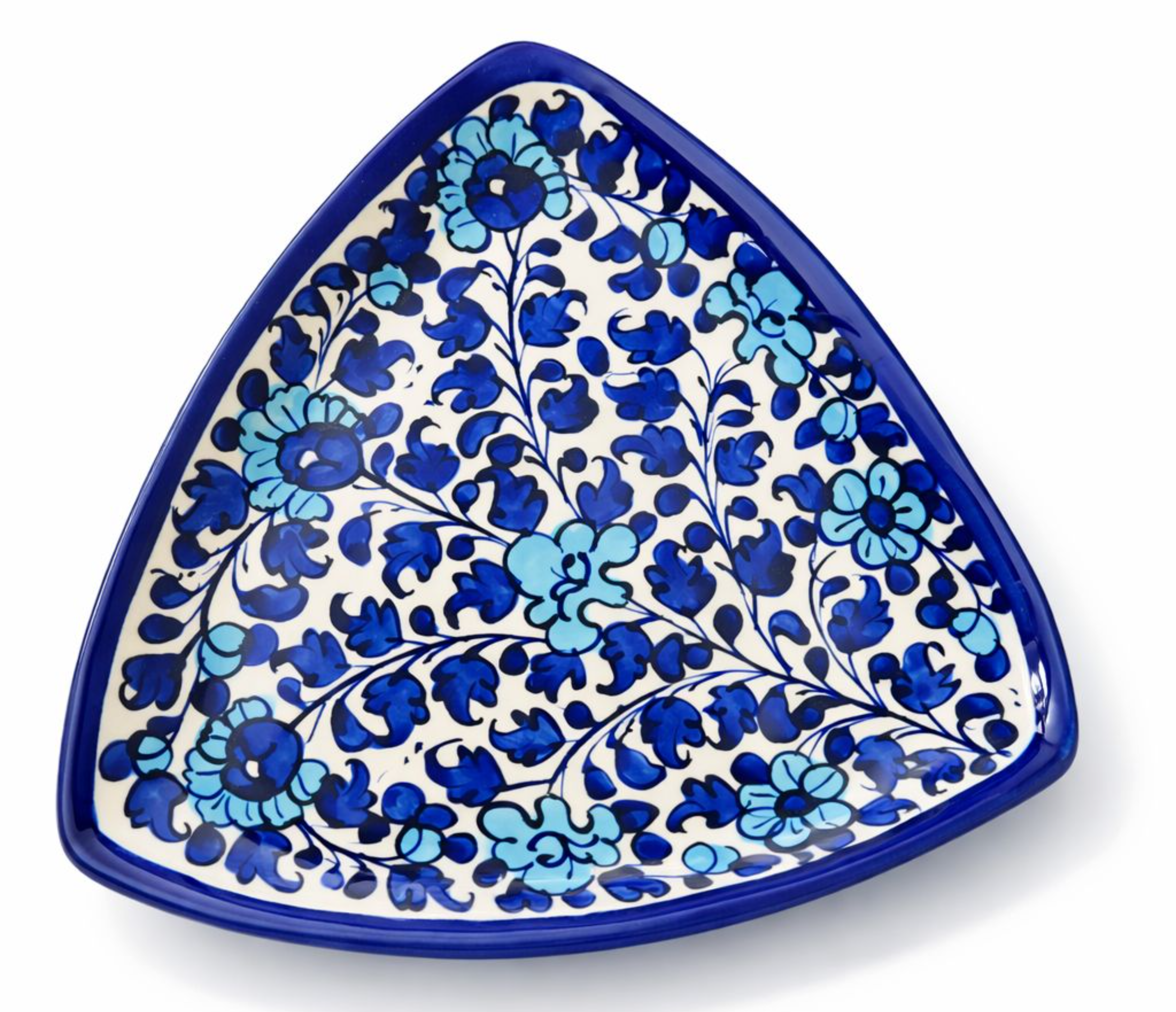 A true statement of artistry, this handcrafted triangular Blue Pottery tray is designed to bring elegance and tradition into your home. Featuring intricate floral vines in rich cobalt and soft sky-blue tones, this tray is hand-painted with detailed brushwork and finished with a glossy glaze for a premium look.